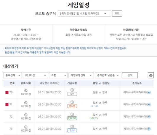 2026 AFC U-23 아시안컵, 한·일전 대상 프로토 승부식 9회차 게임 마감 앞둬