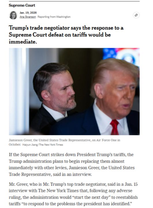 뉴욕타임스(NYT)는 19일(현지시간) 그리어 대표를 인용해 "대법원에서 관세와 관련해 불리한 판결이 나올 경우, 트럼프 행정부는 대통령이 지목해온 문제들에 대응할 수 있도록 관세를 복원하는 일을 바로 다음 날 시작할 것"이라고 보도했다.