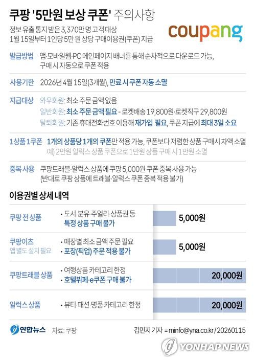 (서울=연합뉴스) 김민지 기자 = 쿠팡이 개인정보유출에 대한 보상책으로 마련한 '5만원 구매이용권'을 15일부터 3천만명에게 순차적으로 지급한다. 쿠팡은 이날 정보 유출 통지를 받은 약 3천370만명의 고객을 대상으로 1인당 5만원의 구매이용권 지급을 시작했다. minfo@yna.co.kr 트위터 @yonhap_graphics 페이스북 tuney.kr/LeYN1 (끝) <저작권자(c) 연합뉴스, 무단 전재-재배포, AI 학습 및 활용 금지> |