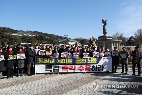 (서울=연합뉴스) 김성민 기자 = 국민의힘 의원들이 20일 청와대 앞에서 열린 통일교 게이트 및 민주당 특검 촉구 기자회견에서 손팻말을 들고 있다. 2026.1.20