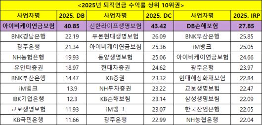 2025년 퇴직연금 수익률 상위 10위권 [사진=금융감독원 연금포털] |