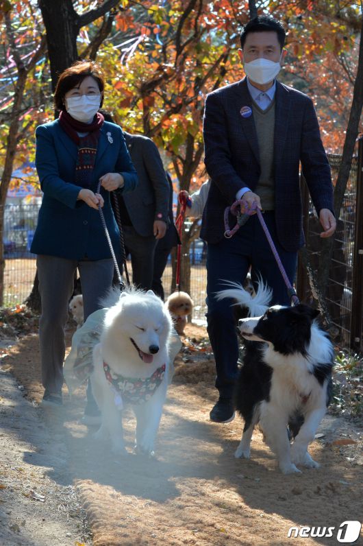 이강덕 경북 포항시장과 김정재 국민의힘(포항·북) 의원이 남구 오천읍 문덕리 포항반려동물테마공원에서 강아지들과 함께 산책하고있는 모습. 뉴스1 자료, 재판매 및 DB금지)ⓒ News1 최창호 기자 |