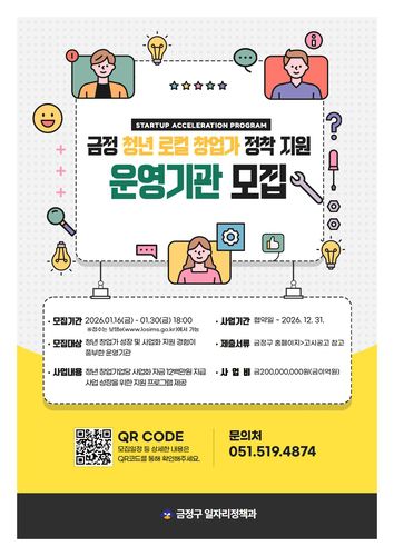 선정된 운영기관은 금정구에 있는 창업 7년 미만 청년(18∼39세) 창업 기업 10팀을 선발해, 기업당 최대 1천2백만 원의 사업화 자금을 지원하고, 사업 성장 단계에 맞춘 맞춤형 프로그램을 운영하게 된다.