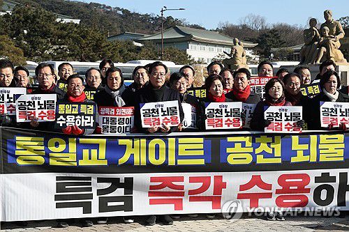 (서울=연합뉴스) 김성민 기자 = 국민의힘 의원들이 20일 청와대 앞에서 열린 통일교 게이트 및 민주당 특검 촉구 기자회견에서 손팻말을 들고 있다. 2026.1.20