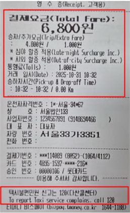 영수증에는 최종 요금과 승·하차 시간 등 주요 정보가 영문으로 표기되며, 심야·시계외 할증 적용 여부도 확인할 수 있다. 하단에는 택시 불편 신고 방법도 함께 안내된다.