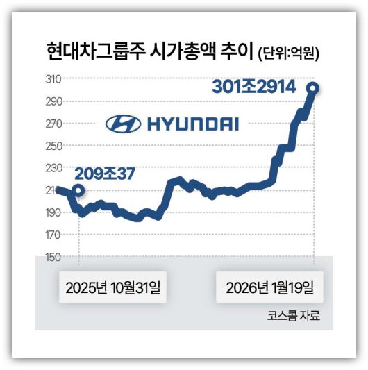 20일 코스콤에 따르면 현대차그룹 시총은 지난해 10월 말 한 차례 200조원을 돌파한 뒤 조정을 거쳤으나, 지난달 초 다시 200조원을 회복하며 추세적 상승 국면에 들어섰다. 이달 들어 상승 속도는 더욱 가팔라졌다. 그룹 시총은 13일 260조원대를 넘어섰고 19일 종가 기준 300조원까지 돌파했다.