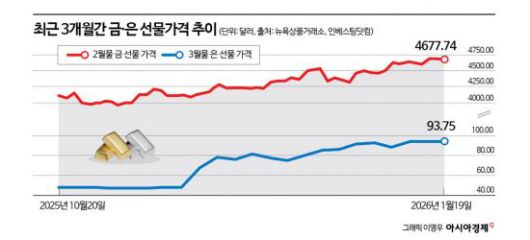 19일(현지시간) 뉴욕상품거래소(COMEX)에서 오후 8시7분 현재 2월물 금 선물 가격은 전거래일 대비 1.79% 상승한 온스당 4677.74달러를 기록하고 있다. 금값은 지난주 사상 최고치를 돌파한 데 이어 이날 다시 한 번 역대 최고가를 경신했다. 은 가격도 뛰고 있다. 3월물 미국 은 선물 가격은 전일보다 5.88% 오른 온스당 93.75달러에 거래되고 있다. 이날 한때 94.74달러까지 오르며 사상 최고치를 기록했다.