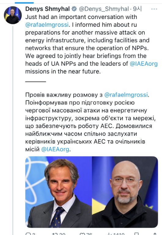 데니스 슈미할 우크라이나 에너지부 장관도 소셜미디어를 통해 "러시아가 원자력 발전소 운영과 연계된 시설을 겨냥한 추가 공격을 준비 중이라는 정보가 있다"고 밝히며, 이 같은 우려를 국제원자력기구(IAEA)에 공식 통보했다고 밝혔다. 또 이와 관련해 IAEA 측과 협의가 진행 중이라고 덧붙였다.
