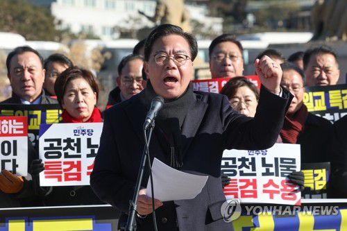 (서울=연합뉴스) 김성민 기자 = 국민의힘 송언석 원내대표가 20일 청와대 앞에서 열린 통일교 게이트 및 민주당 특검 촉구 기자회견에서 구호를 외치고 있다. 2026.1.20