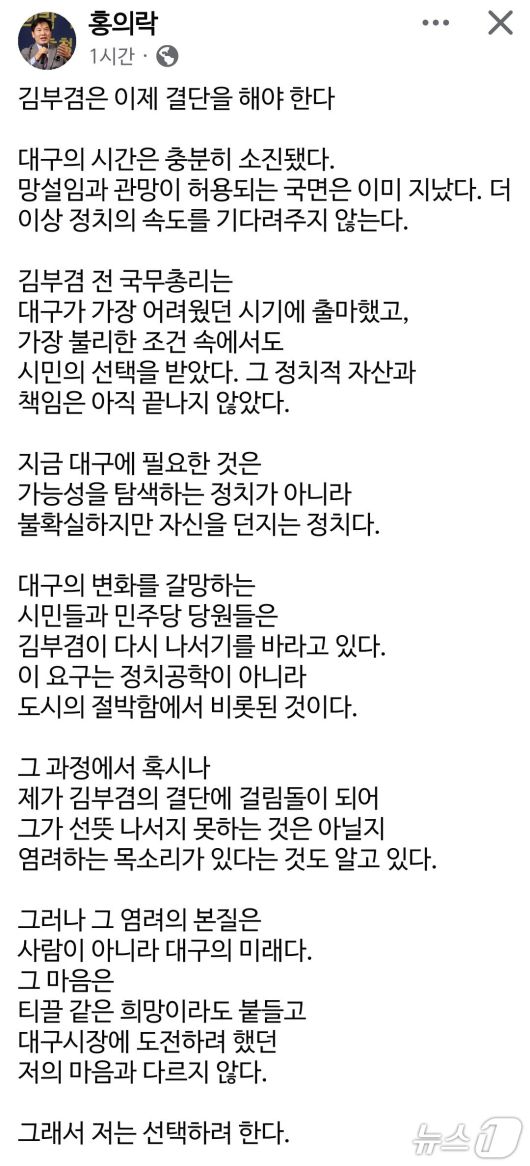 여당이 6·3 지방선거 대구시장 출마 예정자 선정을 두고 고심에 빠진 모양새다. 이미지는 김부겸 전 국무총리 대구시장 선거 출마를 촉구하는 내용을 담은 홍의락 전 대구시 경제부시장 페이스북 갈무리. (재판매 및 DB 금지)/뉴스1 |