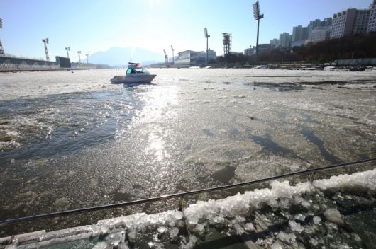 강한 한파로 인해 경정장 수면이 얼어붙었다. 사진제공=국민체육진흥공단. |