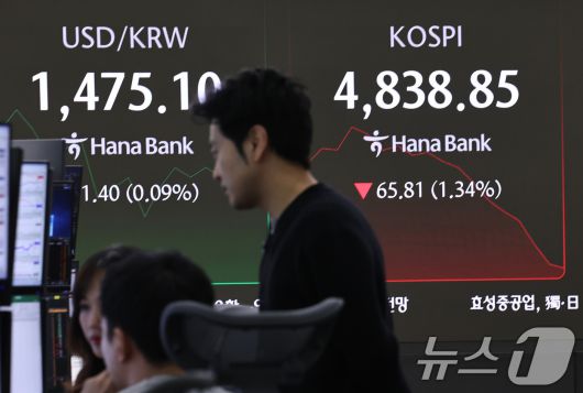 코스피는 전일 대비 21.3p(0.43%) 하락한 4883.36을 가리키고 있다. 장 중 4823.88까지 밀렸다.