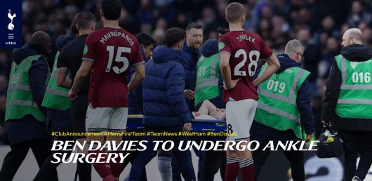 데이비스는 지난 18일 영국 런던 토트넘 홋스퍼 스타디움에서 열린 웨스트햄 유나이티드와의 프리미어리그 22라운드 경기에서 불의의 부상을 당했다.