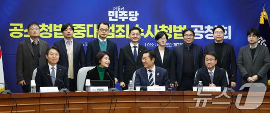 (서울=뉴스1) 유승관 기자 = 정청래 더불어민주당 대표와 한병도 원내대표를 비롯한 참석자들이 20일 서울 여의도 국회에서 열린 공소청법·중대수사청법 공청회(정책의원총회)에서 기념 촬영을 하고 있다. 2026.1.20/뉴스1fotogyoo@news1.krCopyright ⓒ 뉴스1. All rights reserved. 무단 전재 및 재배포, AI학습 이용 금지.