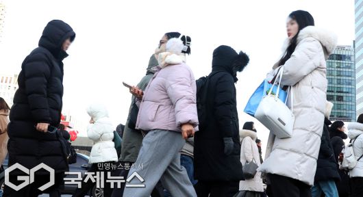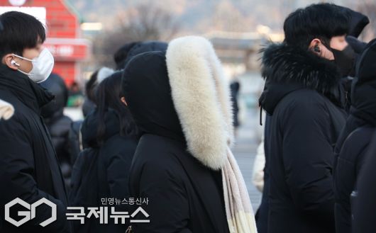 (서울=국제뉴스) 중부지방을 중심으로 한파특보가 발령된 20일 광화문역 부근 시민들이 두터운 옷을 입고 출근길을 서두르고 있다./사진=이용우 기자