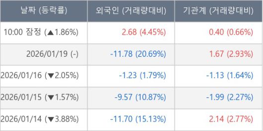 [서울=뉴스핌] 로보뉴스 = 20일 10시 15분 현재 현대로템(064350)은 외국인과 기관이 각각 2.68 만 주, 0.40 만 주 순매수(잠정) 하면서 전일 대비 1.86% (현재가 219,000원) 상승하고 있다.