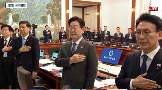 이재명 대통령이 20일 오전 청와대에서 국무회의를 주재하면서 국기에 대한 경례를 하고 있다. [사진=KTV] |