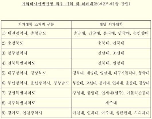 지역의사양성법 시행령 및 시행규칙 제정안은 제4조에 규정된 지역의사선발전형의 선발 비율, 선발에 필요한 절차 등을 규정했다. 법 제5조에 따라 지역의사선발전형 입학생에게 지원하는 학비 등의 지원 사항과 지원 중단 사유, 반환금의 산정 방법 등을 규정했다.