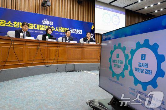 (서울=뉴스1) 유승관 기자 = 정청래 더불어민주당 대표와 한병도 원내대표가 20일 서울 여의도 국회에서 열린 공소청법·중대수사청법 공청회(정책의원총회)에서 윤창렬 국무조정실장(검찰개혁 추진단장)의 정부안 발표를 지켜보고 있다. 2026.1.20/뉴스1fotogyoo@news1.krCopyright ⓒ 뉴스1. All rights reserved. 무단 전재 및 재배포, AI학습 이용 금지.