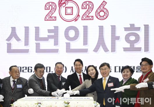 오세훈 서울시장이 20일 서울 중구 서울시청에서 열린 2026년 대한노인회 서울시연합회 신년인사회에서 참석자들과 떡케이크 커팅을 하고 있다. 왼쪽 세 번째부터 고광선 대한노인회 서울시연합회장, 오세훈 서울시장, 최호정 서울시의회 의장, 정근식 서울시교육감. /정재훈 기자