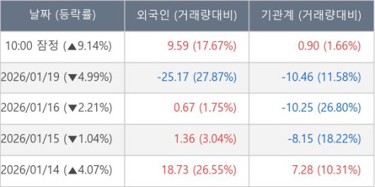 [서울=뉴스핌] 로보뉴스 = 20일 10시 15분 현재 실리콘투(257720)는 외국인과 기관이 각각 9.59 만 주, 0.90 만 주 순매수(잠정) 하면서 전일 대비 9.14% (현재가 43,600원) 상승하고 있다.