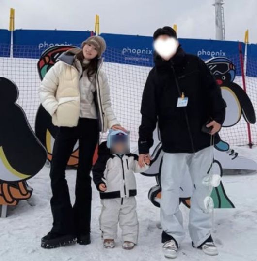손연재는 밝은 색 패딩과 비니를 착용한 채 포즈를 취했고, 아들은 스키복 차림으로 부모 손을 잡고 서 있어 눈길을 끌었다.