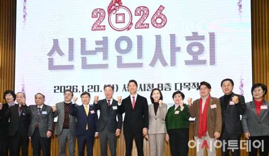 오세훈 서울시장이 20일 서울 중구 서울시청에서 열린 2026년 대한노인회 서울시연합회 신년인사회에서 참석자들과 기념촬영을 하고 있다. /정재훈 기자
