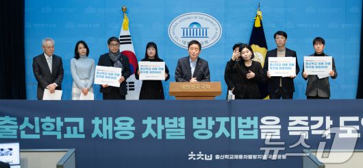(서울=뉴스1) 이승배 기자 = 강득구 더불어민주당 의원이 20일 서울 여의도 국히 소통관에서 채용에서의 학력차별 금지 법안 관련 기자회견을 하고 있다. 2026.1.20/뉴스1