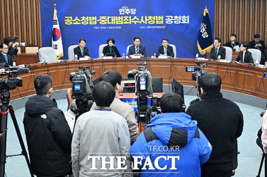 [더팩트ㅣ국회=남용희 기자] 정청래 더불어민주당 대표(왼쪽 세 번째)가 20일 오전 서울 여의도 국회에서 열린 공소청법·중대범죄수사청법 공청회에서 발언을 하고 있다.