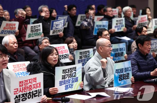 (서울=뉴스1) 김도우 기자 = 적대종식 평화협력 촉구 국회, 종교, 시민사회 시국회의가 20일 서울 중구 프레스센터에서 접경지역 적대행위와 한미연합군사연습 중단을 촉구하고 있다. 2026.1.20/뉴스1