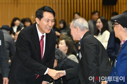 오세훈 서울시장이 20일 서울 중구 서울시청에서 열린 2026년 대한노인회 서울시연합회 신년인사회에서 참석자들과 인사를 나누고 있다. /정재훈 기자