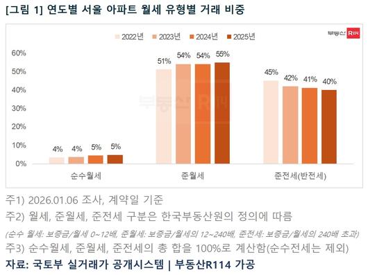 부동산R114가 국토교통부 실거래가 자료를 분석한 결과, 서울 아파트 임대차 계약 가운데 준월세 비중은 ▷2022년 51% ▷2023년 54% ▷2024년 54% ▷2025년 55%로 해마다 확대됐다. 반면 전세 보증금이 월세의 240배를 웃도는 ‘준전세’ 비중은 2022년 45%에서 2023년 42%, 2024년 41%, 2025년 40%로 점차 줄었다. 전세 성격이 강한 계약은 감소하고 월세 요소가 결합된 계약이 늘어난 셈이다.