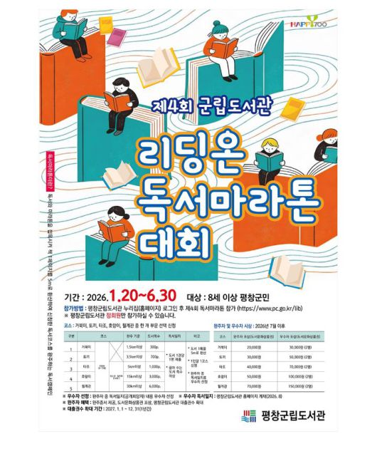 이현진 군 인재육성과장은 "독서 마라톤 대회를 통해 많은 군민이 독서를 생활화하고 책 읽는 습관 형성에 도움이 되길 바란다"며 "평창군 리딩온 독서 마라톤 대회가 군민 독서 문화 활성화를 위한 발판이 될 수 있도록 노력하겠다"고 말했다.