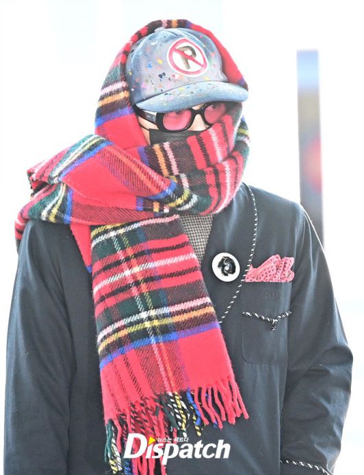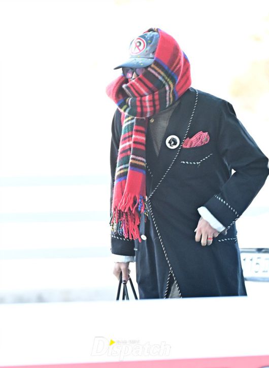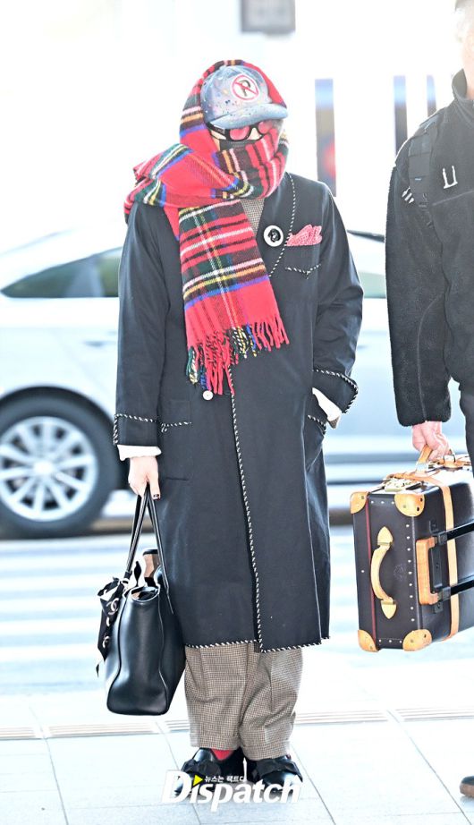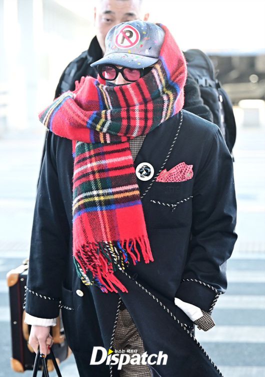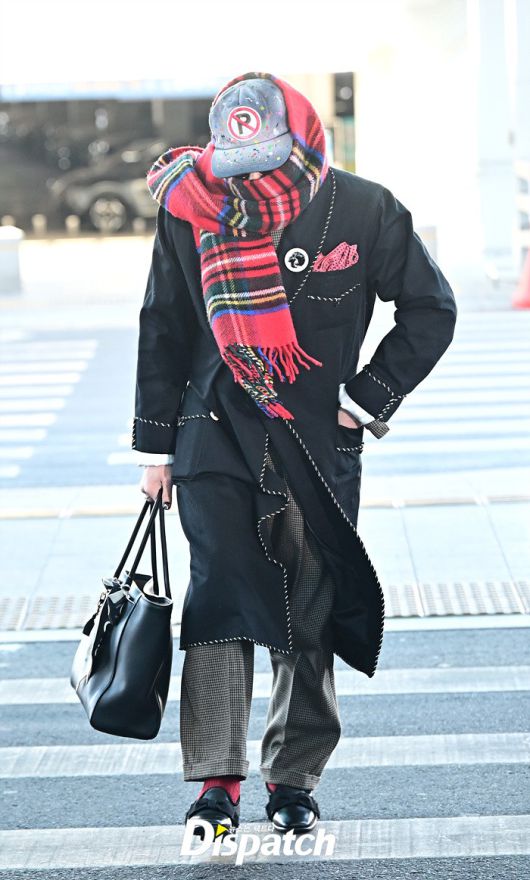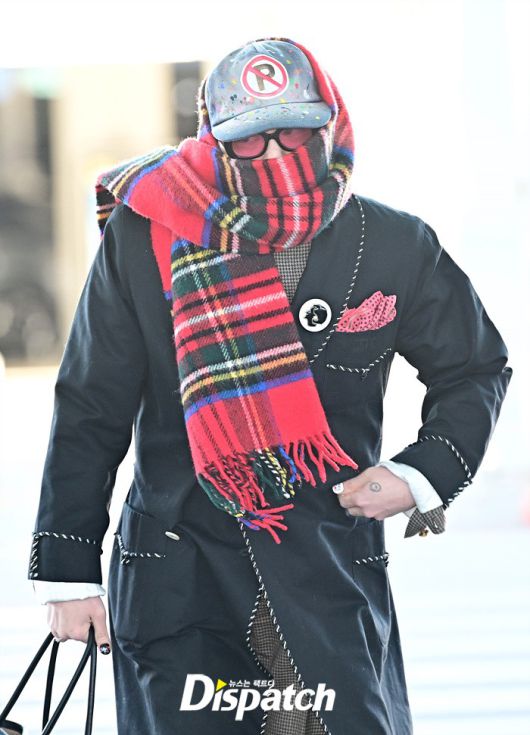 지드래곤은 강렬한 스타일로 시선을 사로 잡았다. 블랙 컬러의 롱코트와 체크 진, 마스크와 머플러로 남다른 패션감각을 뽐냈다.