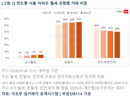 20일 부동산R114에 따르면 지난해 서울 아파트 임대차 계약 중 준월세 비중은 55%에 달했다. △2022년 51% △2023년 54% △2024년 54% 등 준월세 비중 확대가 꾸준히 이어지는 모습이다. 반면 전세 보증금이 월세의 240배보다 높아 전세 성격이 강한 준전세의 비중은 같은 기간 42%에서 40%로 감소했다. 임대차시장의 중심이 전세에서 월세로 이동하고 있다는 의미로 분석된다.