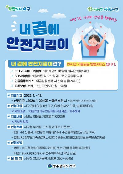 광주광역시 서구는 여성 1인 가구 등의 주거 안전을 위한 '안전지킴이 지원사업'을 추진한다.
