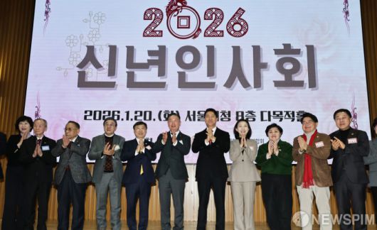 [서울=뉴스핌] 양윤모 기자 = 오세훈 서울시장이 20일 오전 서울시청 다목적홀에서 개최된 '2026년 대한노인회 서울연합회 신년인사회' 행사에 참석해 박수치며 기념촬영을 하고 있다. 행사에는 오세훈 서울시장,고광선 대한노인회 서울시연합회장,최호정 서울시의회 의장, 정근식 서울시 교육감등 300여명이 참석했다. 2026.01.20 yym58@newspim.com
