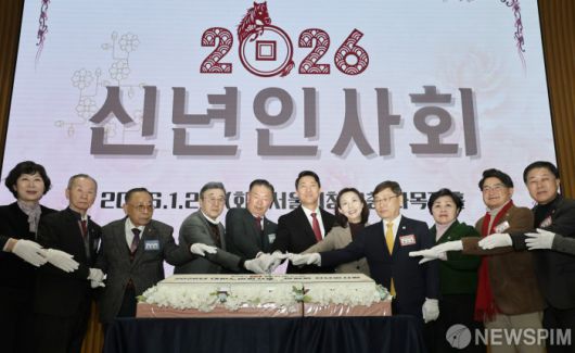 [서울=뉴스핌] 양윤모 기자 = 오세훈 서울시장이 20일 오전 서울시청 다목적홀에서 개최된 '2026년 대한노인회 서울연합회 신년인사회' 행사에서 참석자들과 축하 떡을 절단하고 있다. 행사에는 오세훈 서울시장,고광선 대한노인회 서울시연합회장,최호정 서울시의회 의장, 정근식 서울시 교육감등 300여명이 참석했다. 2026.01.20 yym58@newspim.com |