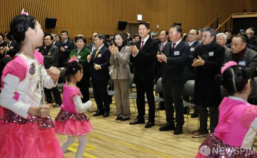 [서울=뉴스핌] 양윤모 기자 = 오세훈 서울시장이 20일 오전 서울시청 다목적홀에서 개최된 '2026년 대한노인회 서울연합회 신년인사회' 행사에서 참석자들과 어린이들의 율동에 맟추어 박수를 보내고 있다. 행사에는 오세훈 서울시장,고광선 대한노인회 서울시연합회장,최호정 서울시의회 의장, 정근식 서울시 교육감등 300여명이 참석했다. 2026.01.20 yym58@newspim.com