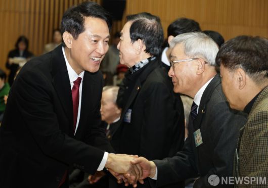 [서울=뉴스핌] 양윤모 기자 = 오세훈 서울시장이 20일 오전 서울시청 다목적홀에서 개최된 '2026년 대한노인회 서울연합회 신년인사회' 행사에서 참석자들과 악수를 하고 있다. 행사에는 오세훈 서울시장,고광선 대한노인회 서울시연합회장,최호정 서울시의회 의장, 정근식 서울시 교육감등 300여명이 참석했다. 2026.01.20 yym58@newspim.com