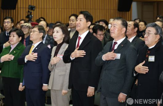 [서울=뉴스핌] 양윤모 기자 = 오세훈 서울시장이 20일 오전 서울시청 다목적홀에서 개최된 '2026년 대한노인회 서울연합회 신년인사회' 행사에서 국민의례를 하고 있다. 행사에는 오세훈 서울시장,고광선 대한노인회 서울시연합회장,최호정 서울시의회 의장, 정근식 서울시 교육감등 300여명이 참석했다. 2026.01.20 yym58@newspim.com