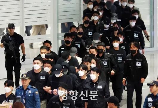 지난해 10월18일 캄보디아에서 보이스피싱 등 범죄에 가담해 현지 이민 당국에 구금됐던 한국인들이 인천공항을 통해 송환되고 있다. 문재원 기자 |