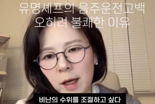 곽정은은 지난 19일 자신의 채널에 '유명 셰프의 음주 운전 고백 오히려 불쾌한 이유'라는 제목의 영상을 게시했다. 영상 속 곽정은은 "한 유명 셰프가 무려 3번의 음주 운전 경력이 있다는 사실을 스스로 고백했다. 이 뉴스가 왜 이렇게 불편하게 느껴지는지 제가 심리학적으로 풀어드리겠다"고 말했다.