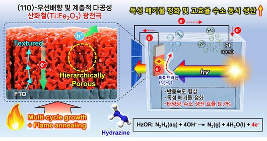 또한 연구팀은 느린 산화 반응을 해결하기 위해 하이드라진 폐기물을 산화 반응의 연료로 활용하는 전략을 도입, 수소 생산 효율을 제한하던 반응 장벽을 효과적으로 우회하며 기존 대비 비약적으로 상승한 광전류 값을 확보하는 데 성공했다.