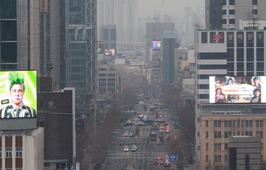 초미세먼지 농도가 ‘나쁨’ 수준을 보인 18일 서울 광화문역 인근이 뿌옇다. [연합] |