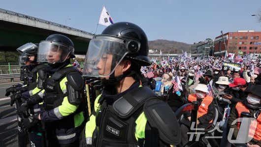 윤석열 대통령의 탄핵 심판 선고일이었던 지난해 4월 4일 서울 용산구 한남동 대통령 관저 앞에서 경찰기동대가 경계근무를 서고 있다. 2025.4.4/뉴스1 ⓒ News1 김성진 기자 |