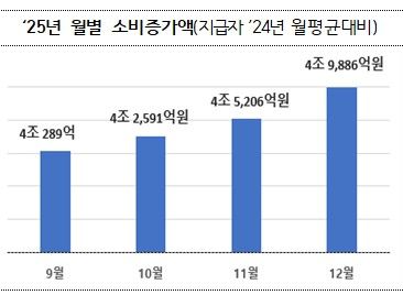 실제 카드 소비 지표에서도 상승 효과가 확인됐다. 지난해 9~11월 국내 개인카드 사용액(9개 카드사 기준)의 전년 동월 대비 증가율은 9월 4.8%, 10월 2.3%, 11월 4.5%로 나타났다. 이는 2024년 같은 기간의 증가율(9월 1.2%, 10월 2.8%, 11월 2.7%)과 비교해 전반적으로 높은 수준이다.