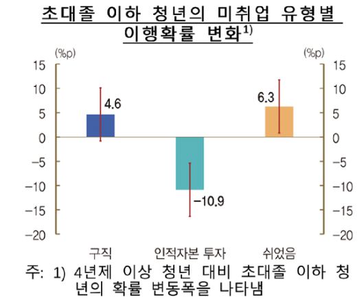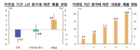 한은은 "미취업 상태의 고학력 청년층은 취업 준비나 교육훈련 참여 활동을 선택하는 경향이 높으나, 초대졸 이하 청년층과 마찬가지로 미취업 기간이 늘어날수록 '쉬었음' 상태에 있을 확률은 높아졌다"고 설명했다.