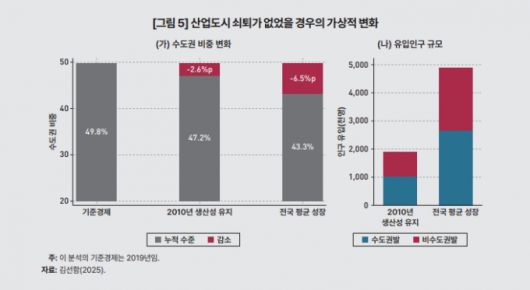 2010년~2019년 생산성 감소를 겪은 제조업 도시들이 인구수용비용과 쾌적도는 2019년 경제 수준이고 생산성만 2010년 수준을 유지했을 경우 수도권 인구 비중은 현실보다 2.6%p(포인트) 낮은 47.2%에 머물렀을 것이란 분석이다.