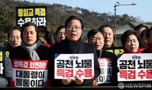 [서울=뉴스핌] 정일구 기자 = 송언석 국민의힘 원내대표와 당 소속 의원들이 20일 오전 서울 종로구 청와대 분수대 앞에서 열린 통일교 게이트·더불어민주당 공천뇌물 특검 촉구 규탄대회에서 구호를 외치고 있다. 2026.01.20 mironj19@newspim.com